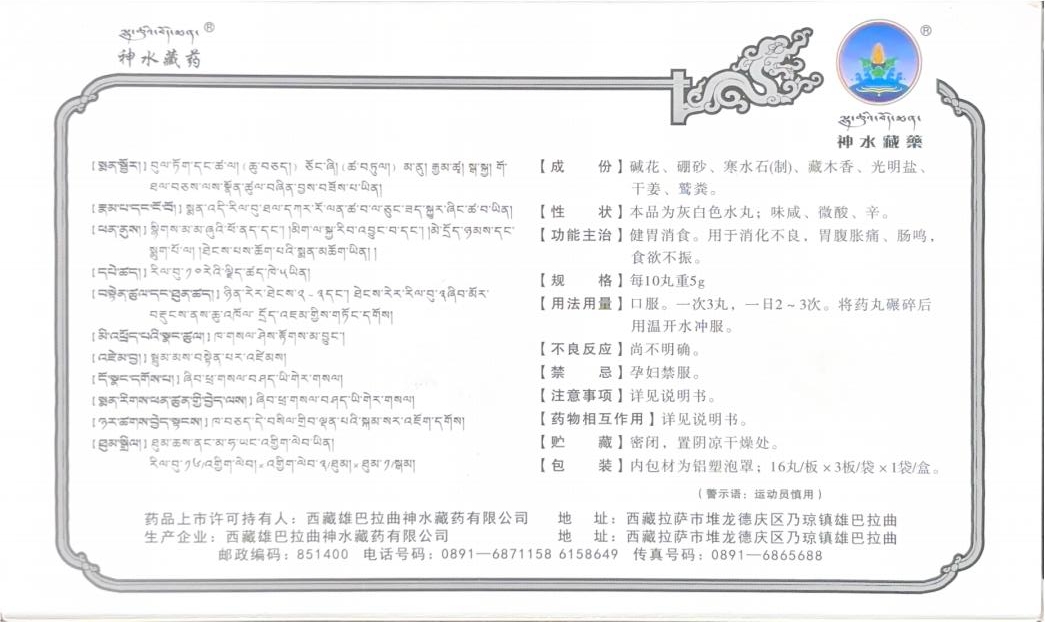【产品名称】加味白药丸 【成份】碱花、硼砂、寒水石(制)、藏木香、光明盐、干姜、鹫粪。 【性状】本品为灰白色水丸;味咸、微酸、辛。 【功能主治】健胃消食。用于消化不良,胃腹胀痛、肠鸣,食欲不振。 【规格】每10丸重5g 【用法用量】口服。一次3丸,一日2~3次。将药丸碾碎后用温开水冲服。 【不良反应】尚不明确。 【禁忌】孕妇禁服。 【注意事项】详见说明书。 【药物相互作用】详见说明书。 【贮藏】密闭,置阴凉干燥处。 【包装】内包材为铝塑泡罩;16丸/板x3板/袋x1袋/盒。